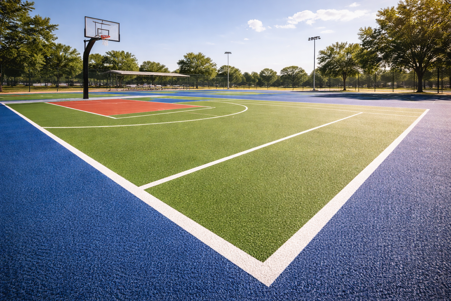Texas experiences intense heat, sudden rain, and strong sunlight. Acrylic Sports Flooring resists UV damage and temperature changes.